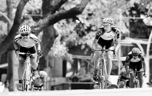 | 22日,海南省第四届体育运动会自行车赛公路大组赛在五指山市举行。海口队和琼中队表现突出,分别包揽男女组的前三名。图为海口队车手符龙(右)和琼中队车手冯全冲刺终点。 本报记者 宋国强 摄 |