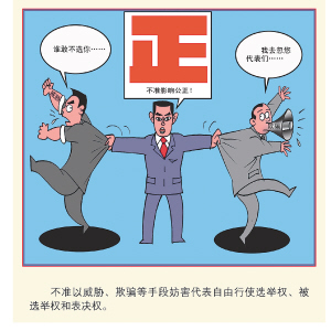 不准以威胁、欺骗等手段妨害代表自由行使选举权、被选举权和表决权。