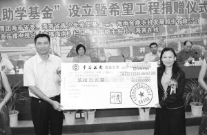 | 每年捐资不少于20万元的海南金鹿农机助学基金是目前海南希望工程系统设立的唯一一家永久性的助学基金,团省委书记孙喆接受公司首笔捐款。 |