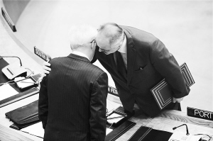 4月21日,在纽约联合国总部安理会会议厅,俄罗斯常驻联合国代表丘尔金(左)和叙利亚常驻联合国代表贾法里(右)在安理会表决前交谈。 联合国安理会21日一致通过决议,决定设立联合国叙利亚监督团(联叙监督团)。 新华社记者 申宏 摄