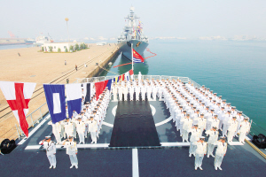 | 参与中俄海上联合军演的海军士兵在军舰上参加升旗仪式。