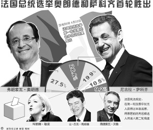 法国总统选举第一轮投票22日结束。初步统计结果显示,左派社会党候选人弗朗索瓦·奥朗德和现任总统萨科齐分别以27.5%和26.6%的得票率领先其他8位候选人进入第二轮投票。两人将于5月6日进行最终角逐,谁能胜出引人关注。