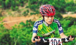 | 来自琼中的车手何冲在山地自行车越野赛女子组比赛中。