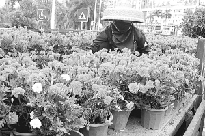 →4月23日,在三亚迎宾路上,三亚园林工人将一盆盆菊花、三角梅等,摆成美丽的图案,迎接五一黄金周国内外游客。 特约记者 孙清 摄