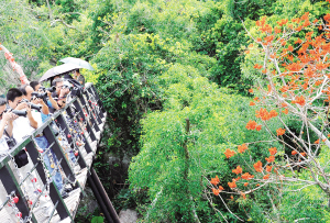 4月18日,三亚亚龙湾热带天堂森林公园,盛开的美丽梧桐花和翩飞其间吸食蕊间花蜜的五彩蜂鸟,吸引了成千上万的游客驻足观赏拍照。 梧桐是极具观赏价值的花树,其花近看似束束炮竹,远观如片片红云。已经成为三亚亚龙湾至海棠湾一带的山谷中美丽的景观。 本报记者 苏建强 摄