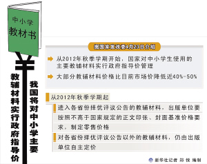 价格比目前市场价降低近40%-50% 据新华社北京4月23日电(记者 江国成)据国家发展和改革委员会23日介绍,从2012年秋季学期开始,国家对中小学生使用的主要教辅材料实行政府指导价管理,大幅降低价格标准,减轻学生教辅材料经济负担。 发展改革委、新闻出版总署、教育部近日联合印发的《关于加强中小学教辅材料价格监管的通知》主要包括三方面的内容:对教辅材料实行政府指导价;加强教辅材料价格公示管理;加强市场综合治理工作。
