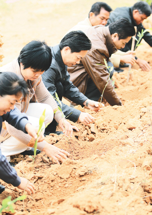 植树造林既是绿化美化,优化生态环境,也是增加森林碳汇,拓展发展空间。要加快制定和实施绿化宝岛的中长期规划和年度计划,全民参与,在路边水边、房前屋后植树造林,巩固天然林和海防林保护建设成果,打造一批城市森林公园、城郊湿地公园,营造全岛天然大氧吧。坚持因地制宜,科学种树,优选乡土树种、珍贵树种和经济果树,兼顾生态效益、景观效益和经济效益。到2016年全省森林覆盖率达到62%,森林总碳储量超过6000万吨,各市县城区绿地率达到35%以上、道路绿化达标率达到95%以上,努力把海南打造成空气清新、四季花开的绿色家园,为子孙后代留下可持续发展的“绿色银行”。