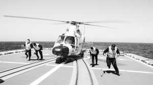 | 直升机准备在“哈尔滨”舰飞行甲板上起飞。 |