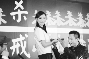 | 25日,电影《杀戒》在京举行新闻发布会,主演刘烨接受倪妮(左)赠送的礼物。新华社发 |