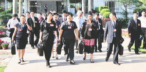 上午8时30分许,海报集团全媒体中心各路记者身着海南日报报业集团统一的红色T恤,陆续抵达会场采访,这是这支队伍首度统一集结。
