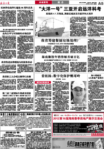 海南日报 本省新闻 综 合 005 2012-04-291 2012年04月29日 星期日