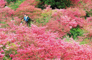 | 湖北麻城龟峰山原生态10万亩连片野生杜鹃竞相怒放,漫山遍野,红花似海,游人如潮,成为湖北假日旅游一大亮点。 |