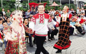 | 外国演员在上海的标志性旅游景点东方明珠广场跳起欢快的民族舞蹈。 (本栏图片均由新华社发) |