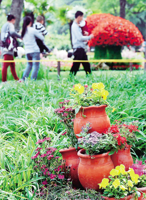 | 几名郑州游客经过一处“陶艺组合”的鸢尾花造型景区。 |