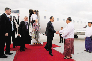4月29日,联合国秘书长潘基文(右三)到达缅甸首都内比都的国际机场时与前来迎接的缅甸外交部长吴温纳貌伦握手。潘基文3天的访问期间将会见缅甸领导人,并就联合国机构如何向缅甸提供帮助等问题与缅方进行讨论。 新华社/路透