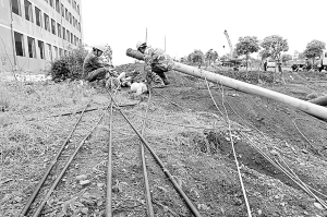 5月1日,吉水县供电公司员工在城西工业园抢修受灾电网。 新华社发(肖春根 摄)