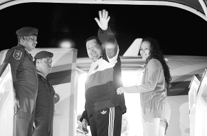 这张委内瑞拉总统府提供的照片显示,4月30日,在西蒙·玻利瓦尔国际机场,委内瑞拉总统查韦斯(中)登机前往古巴前向人群挥手致意。 委内瑞拉总统查韦斯当地时间30日晚再度启程赴古巴,接受新一轮放射治疗。 新华社发