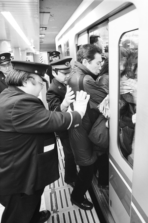 东京地铁在高峰时段,车厢中的乘客会超过容载量的200%,地铁车门都难以关上。这时,就需要地铁“推手”及时出现,把人“塞入”车厢。现在,地铁“推手”已经成为东京地铁的一个固定工种。
