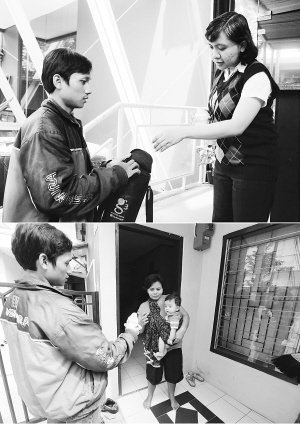 这张拼版照片显示的是1月18日,在印度尼西亚首都雅加达,伦尼(右)在自己的办公室前将准备好的母乳交给快递员(上图)。快递员将伦尼的母乳送达伦尼的家中,交给保姆(下图)。