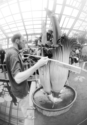 图为在德国波恩的一处植物园,工作人员正在测量巨魔芋。