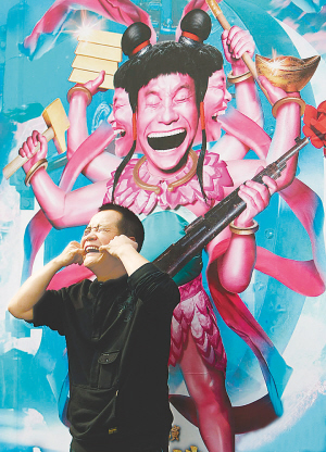 | 《黄金大劫案》导演宁浩模仿身后海报上人物的夸张表情。小新发 |