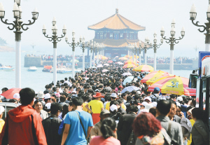 青岛:海滨景点客流井喷。图为5月1日,游客在青岛栈桥景区游览。 新华社发
