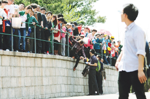 4月30日,在山东威海西霞口野生动物自然保护区,游客不堪拥挤跳离观景通道。“五一”小长假期间,山东威海西霞口野生动物自然保护区游客爆棚。据景区统计数据显示,4月30日景区单日接纳游客量达3.5万余人。 新华社发