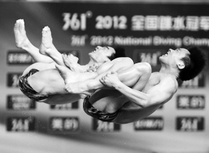 5月3日,在江苏省常州市进行的2012年全国跳水冠军赛暨奥运会选拔赛男子双人3米跳板决赛中,秦凯/罗玉通以473.94分的成绩获得冠军。图为陕西选手秦凯与广东选手罗玉通(右)在比赛中。 新华社发