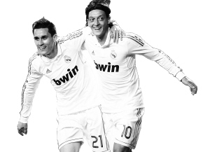 | 3日,皇家马德里队球员厄齐尔(右)进球后与队友卡列洪庆祝。