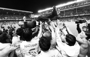 | 3日,皇家马德里队球员举起主教练穆里尼奥庆祝提前夺冠。 新华社发 |
