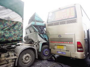 5月3日,青(岛)银(川)高速公路山东高密段青岛方向80至82公里处因大雾发生多起交通事故,涉及车辆近20辆,造成7人不同程度受伤。 新华社发