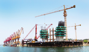 5月4日,备受关注的洋浦———白马井跨海大桥已完成总工程量35%以上。 据了解,目前主桥两个主塔已进入下塔柱施工,南北引桥工程正在加紧施工。 该大桥全长3.3公里,主桥820米,主桥面宽29米,一级公路双向6车道,总投资9.11亿元。去年6月开建,预计明年5月竣工。建成后,洋浦至海口将融入1小时交通圈。 本报记者 苏晓杰 摄