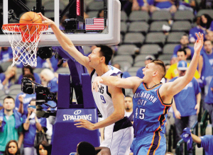 | 易建联(左)在比赛中扣篮。 新华社发 |