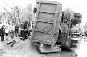 5月6日,在哈尔滨市南岗区西大直街与海关街交口,一辆拉运沙子的货车不慎侧翻,货车车体及倾泻而出的沙子将一辆出租车掩埋,出租车司机被困其中。经过10多分钟将被困司机救出。 新华社发