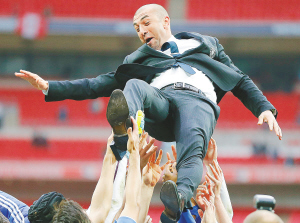| 5月5日,在2011/2012赛季英格兰足总杯决赛中,切尔西队以2:1战胜利物浦队,夺得冠军。图为切尔西队主帅迪马特奥(上)在赛后被球员抛到空中庆祝夺冠。