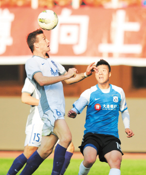 | 6日,天津泰达队球员戈扬(左)在比赛中头球抢点。 新华社发 |