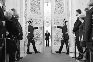 | 5月7日,普京(中)走入克里姆林宫的安德烈耶夫大厅参加总统就职典礼。 |