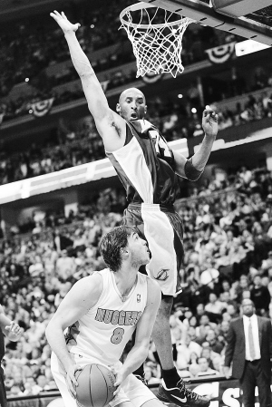 | 5月7日,湖人队球员科比(上)在比赛中防守掘金队球员。