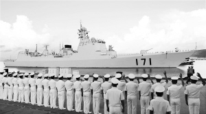 5月7日上午7时,南海舰队某驱逐舰支队“海口”号导弹驱逐舰胜利完成亚丁湾第十批次护航任务后,回到三亚母港,受到热烈欢迎。 本报记者 苏建强 通讯员 肖迎辉 曾行贱 摄