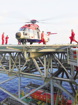 | 一架直升机在“海洋石油981”钻井平台上降落。 |