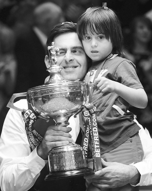 | 奥沙利文(左)在颁奖仪式上与儿子小罗尼一同分享胜利的喜悦。 新华社发 |