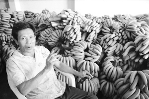 5月8日,塔洋镇鱼良村蕉农符勇尔面对低迷的香蕉价格一脸无奈。 今年琼海香蕉上市时最高收购价曾达到每公斤近3元,近日价格持续走低。塔洋镇一家收购站当天收购价每公斤仅0.8元,比前一天又降0.4元。 特约记者 蒙钟德 摄