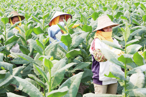 儋州引进古巴雪茄烟草种植项目在光村镇草地坡落户,经过一年的努力,所种的3000亩建恒三号雪茄烟草长势喜人。图为工人在田间管理。 吴文生 摄