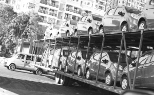 5月9日下午,在海口市南海大道国门大酒店段,一辆满载21辆小轿车的大车在拐弯掉头时,不小心“蹭”伤了身后的小面包车,造成了该路段的堵塞。 本报记者 张杰 摄