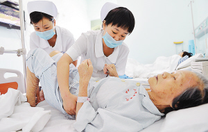 | 5月10日,海口市中医院康复病房内,护士刘琼(右)、张爱琴正在帮助病人做康复治疗。 本报记者 王凯 摄 |