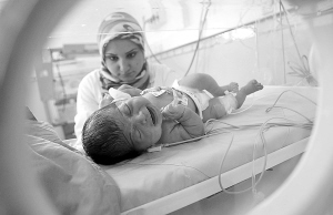 | ↑在加沙地带南部汗尤尼斯的一家医院里,一名护士照料一名在早产儿保育器中的婴儿。 |