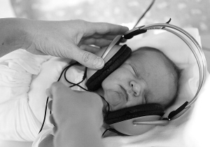 | ↑在斯洛伐克科希策的萨卡医院,护士为婴儿调整播放音乐的耳机。 |