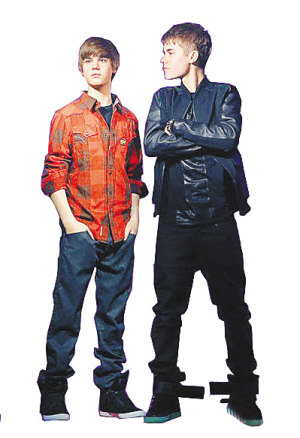 | 贾斯汀·比伯(右)为自己的蜡像揭幕。 |