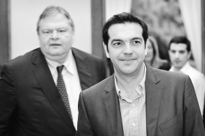 | 5月11日,左派政党联盟领导人齐普拉斯(右)在位于希腊首都雅典的议会会见泛希腊社会主义运动(泛希社运)领导人韦尼泽洛斯(左)后离开。 新华社/法新 |