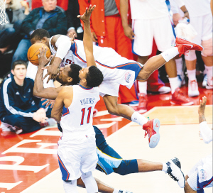 | 快船队球员尼克·杨(下)和布雷德索(上)在比赛中争抢篮板球。 新华社发 |